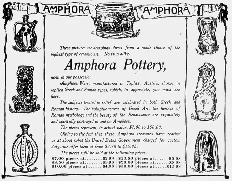 Advertisement, Brooklyn Times-Union, November 28, 1909. An enormous shipment of Amphora products arriving in New York aboard the liner SS Abraham Lincoln in the fall of 1909 led to dramatic reductions in retail prices, helping to bring the objects within reach of middle-class purchasers.