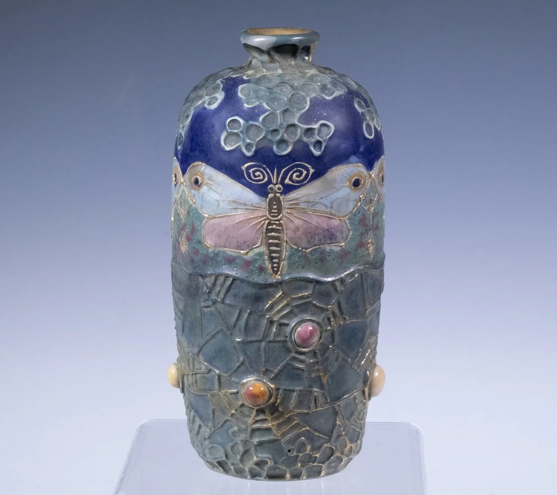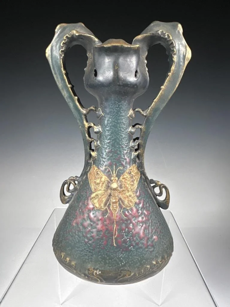 Austria Amphora Art Nouveau Jeweled Butterfly Vase. A choice example of the fully-realized Gres-Bijou style.
