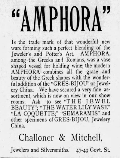 Advertisement, Victoria (B. C.) Daily Times, August 30, 1905, announcing the arrival of Amphora's Gres-Bijou Line. Amphora products were widely sold in fine department stores and specialty shops across much of North America.